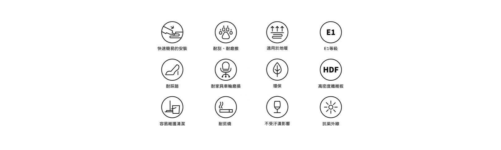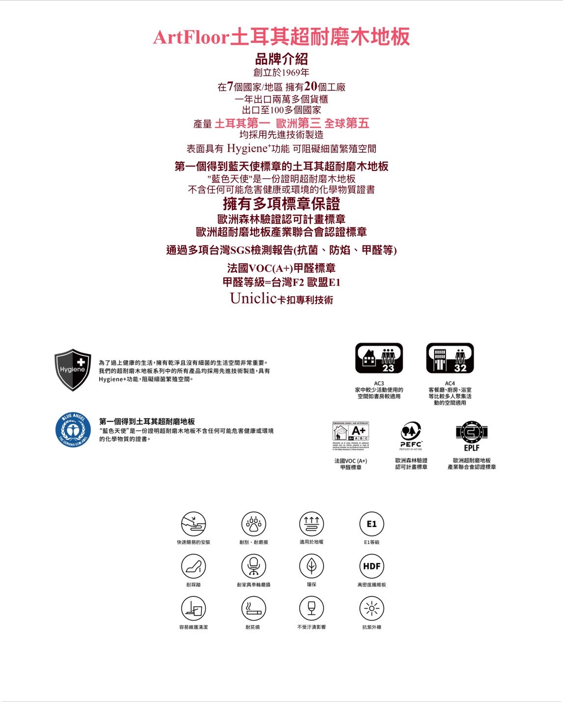 其表層具備防刮耐磨塗層,不易因生活使用造成刮痕,並通過嚴格的環保檢測,達到 E1 等級的低甲醛標準,讓家中空氣更健康。地板擁有良好的防潮與穩定性,不易因濕度變化而翹曲或膨脹,適合台灣高濕度氣候。使用德國卡扣技術可快速施工,不需動用釘膠,未來維修也更加方便。